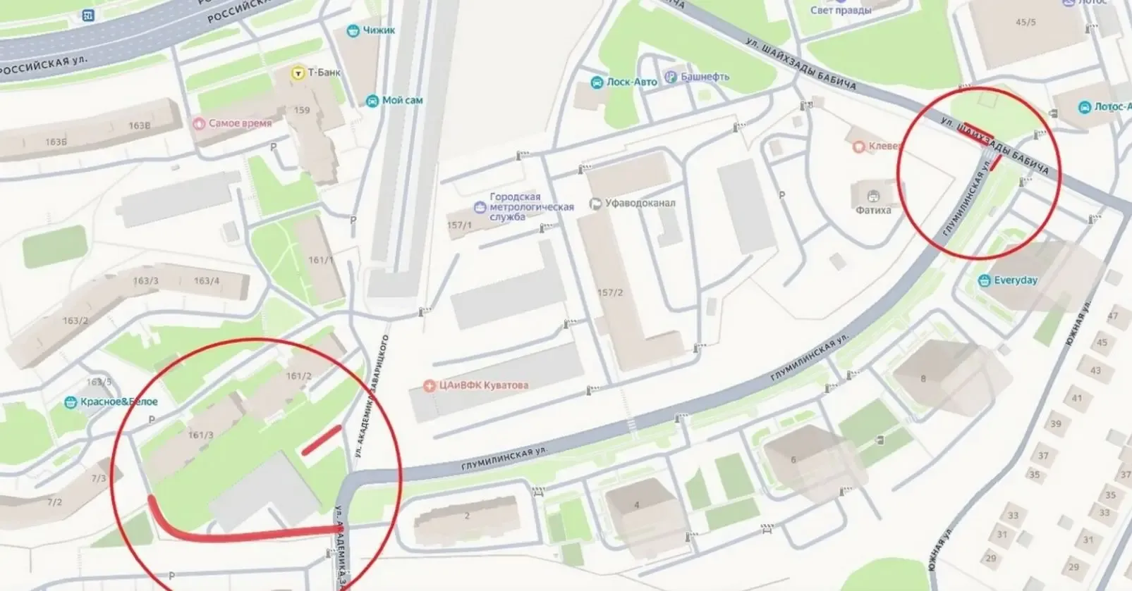 Частично закрыты участки на пересечении улиц Бабича, Шайхзады и Глумилинской. Перекрыты также проезды в районах улиц: Рудольфа Нуреева, 23, Российская, 164 и Глумилинская, 2.