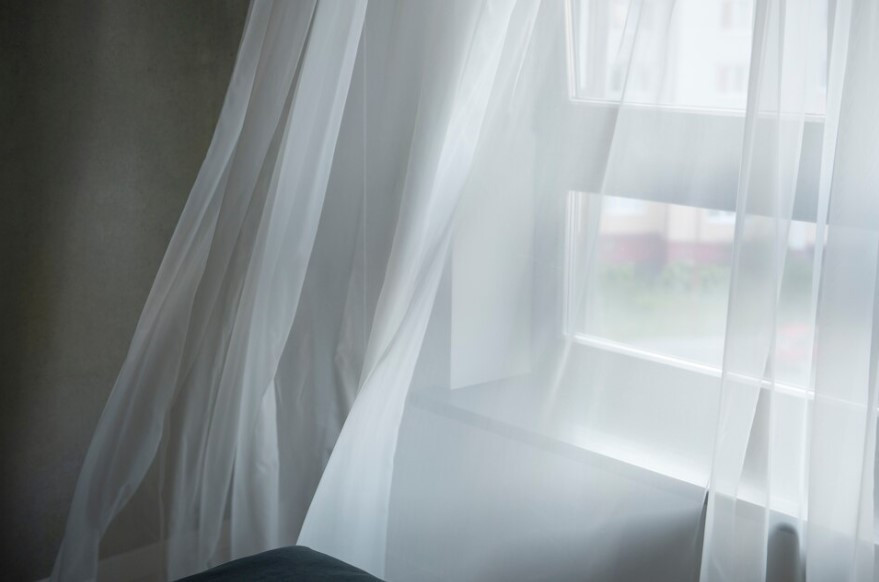 После этого разместите тюль на окне, используя липкую ленту. Нарежьте ленту на небольшие кусочки: одну часть прикрепите к ткани, а другую — к оконному проему с помощью клея. Теперь можно аккуратно установить тюль.